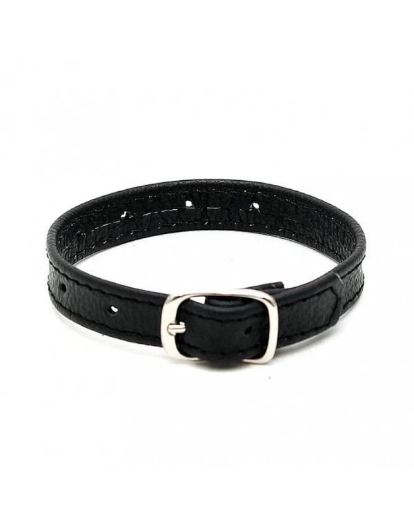 Leren bandje voor om de penis/balzak. 1.3 cm breed, 22 cm lang. Met een zilverkleurig metalen gespje.