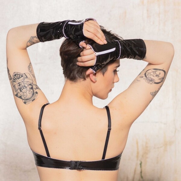 Sierlijke vingerloze handschoenen gemaakt van hoogglanzende zwarte lak met een wit ritsje en witte geschulpte biesjes.