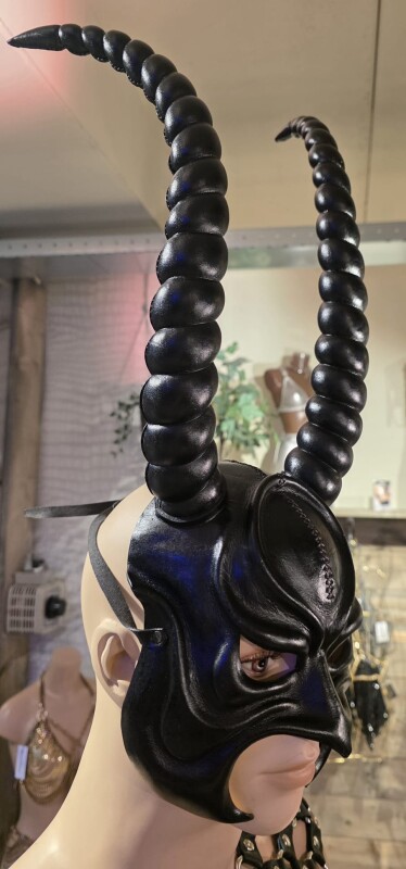 Prachtig handgemaakt echt leren masker met lange gedraaide hoorns. Te bevestigen met een leren bandje met gesp achter het hoofd.
