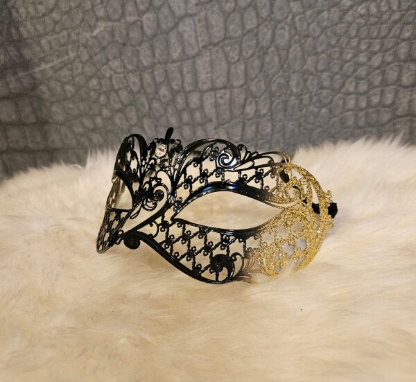 Handgemaakt metalen masker met mooi kanten design, in zwart met goud. Achter het hoofd een lint om te strikken. Enigszins buigzaam voor een perfecte pasvorm.