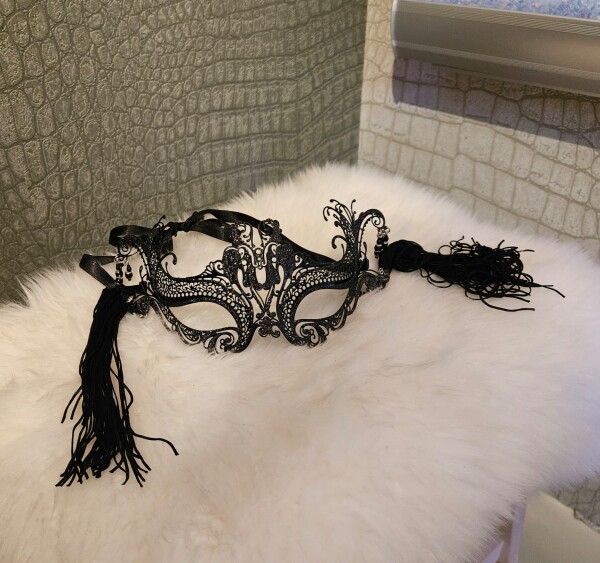 Handgemaakt metalen masker met mooi kanten design, in zwart. Dit masker heeft aan beide zijden leuke juweel-ornamentjes en prachtige franjes.