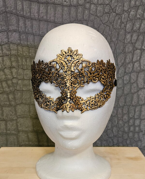 Flexibel kanten oogmasker met een goudkleurige glitterende finish. Sluit met een strik-lint achterop het hoofd.