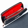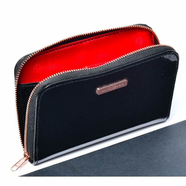 Prachtige portemonnaie in zwart lak, met een rode voering en een rose-goudkleurige rits.