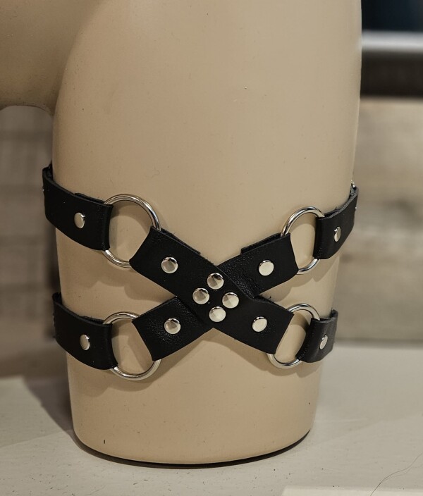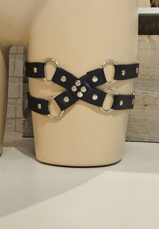 Leuk dubbel beenbandje met kunstleren kruis aan de voorkant. De bandjes rond het been zijn elastisch en verstelbaar.