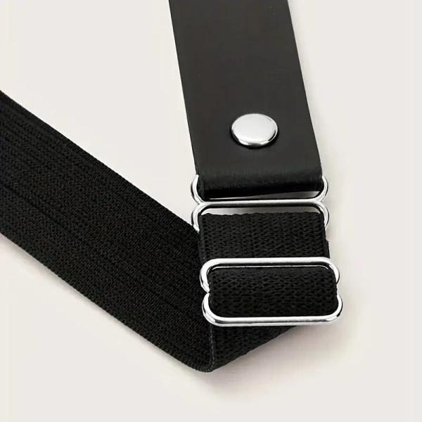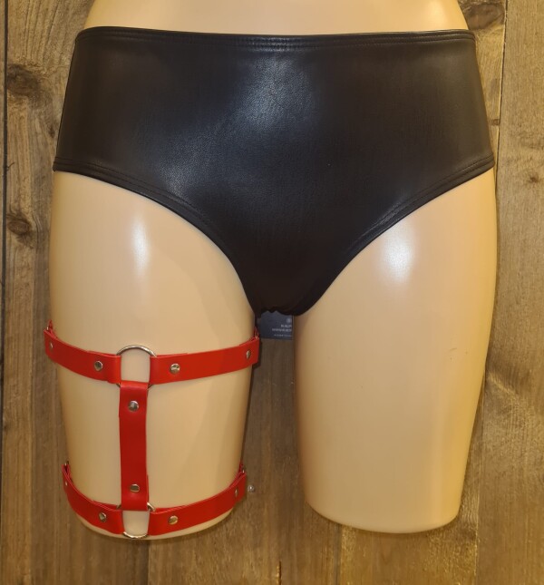 Kunstleren beenharnas. De bandjes zijn aan de achterkant voorzien van een elastische verstelbare band, zodat dit leuke beenharnas altijd als gegoten zit.