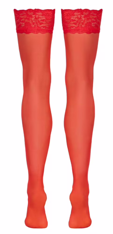 Rode, zijdeachtige kousen van Cottelli LEGWARE met een elastische, 9 cm brede kanten bovenkant. Garen dikte 20 deniers. Oeko-Tex gecertificeerd.
