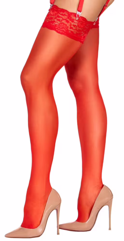 Zijdeachtige kousen om aan de jarretelgordel te klemmen. Een absolute blikvanger in vuurrood en met 7 cm breed kant. 20 den. Oeko-Tex gecertificeerd.