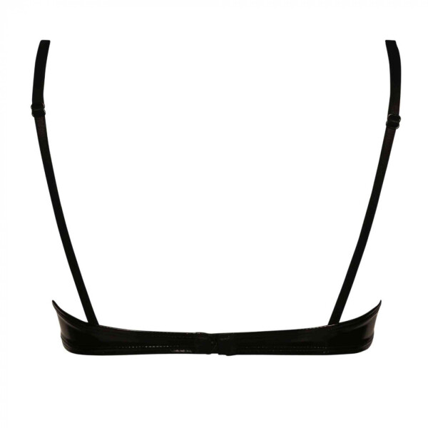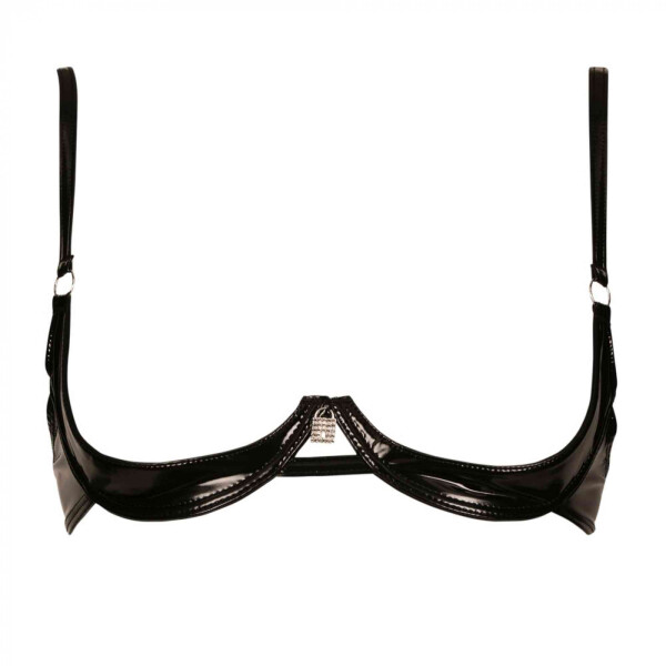 Stijlvolle kwart-cup BH gemaakt van hoogglans zwarte lak, met een fraai strass sierslotje voorop.