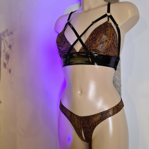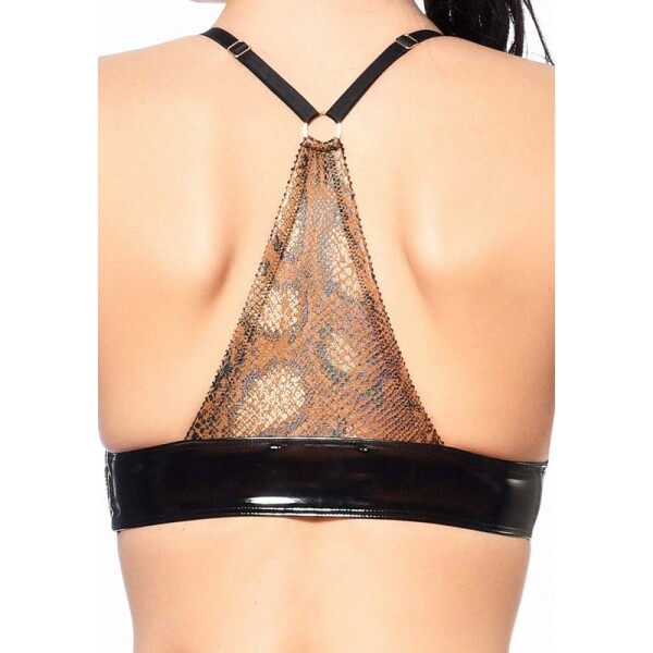 Triangel BH met mooie bruin-gouden slangenprint en zwarte lak details. Alle bandjes zijn verstelbaar en hebben mooie goudkleurige schuivertjes. De sluiting van deze BH zit aan de zijkant.