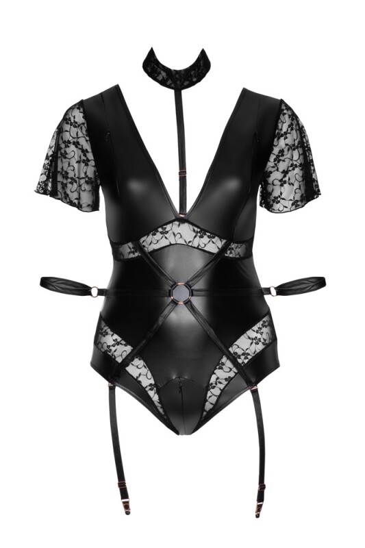 Deze prachtige body met korte mouwen maakt indruk met de diepe halsuitsnijding en de vele afneembare en verstelbare elementen, zoals jarretels, kraag en armmanchetten aan de zijkanten. Deze manchetten maken de bodysuit meer dan een kledingstuk en maken zachte bondagespelletjes mogelijk. De 2-weg rits in het kruis maakt ook seks mogelijk zonder dit mooie stuk eerst uit te hoeven doen. ook de cups hebben een ritsje, zodat de tepels vrij kunnen zijn wanneer gewenst.