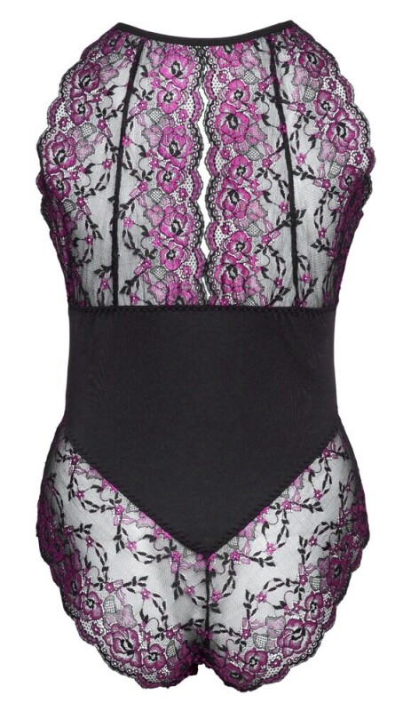 Body van Cottelli CURVES vervaardigd uit fijn 2-kleurig bloemenkant met ondoorzichtig inzetstuk in de taille. Geraffineerde uitsnijdingen voor en achter, met clipsluiting in de nek. In het kanten broekje met erotisch-praktische drukknoopsluiting in het kruisje.