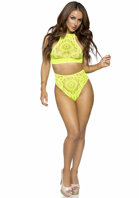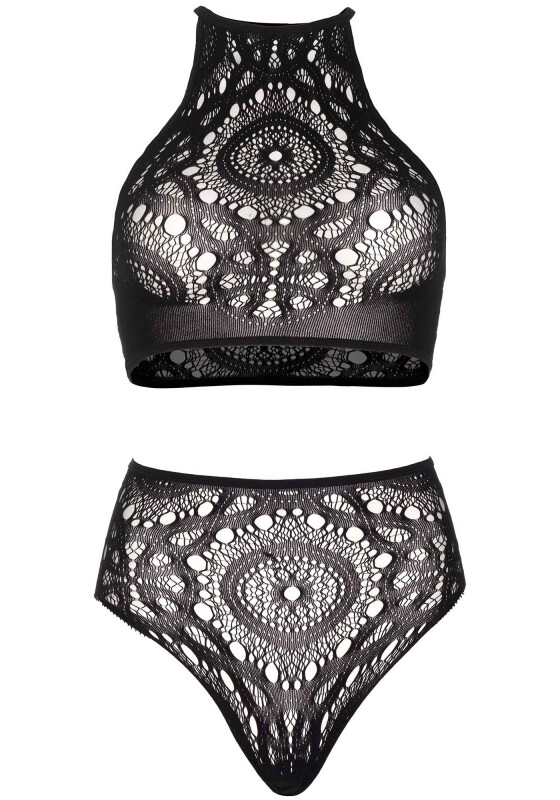 Gehaakte kanten halter crop top met bandjes op de rug en bijpassende string met hoge taille