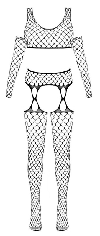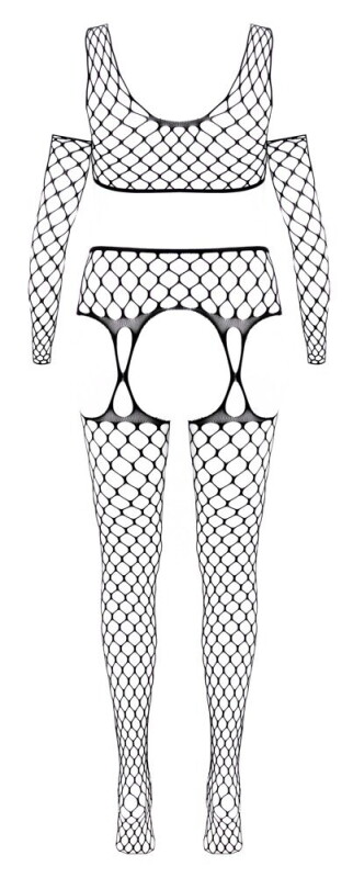 3-delig zwart lingeriesetje Fantasy by Cottelli met een kort topje, jarretelpanty's en een paar armwarmers. Allemaal gemaakt van groot gaas - naadloos, zeer elastisch en zacht en soepel voor maximaal comfort. Jarretel panty open bij het kruis en luchtig, versterkt teengedeelte.