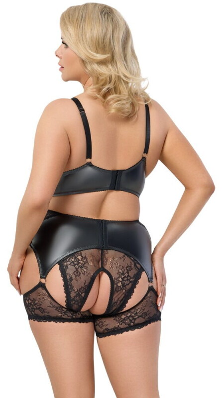 Zwart jarretelsetje van Cottelli CURVES met een bh, kruisloze slip en jarretelgordel met kousenband.