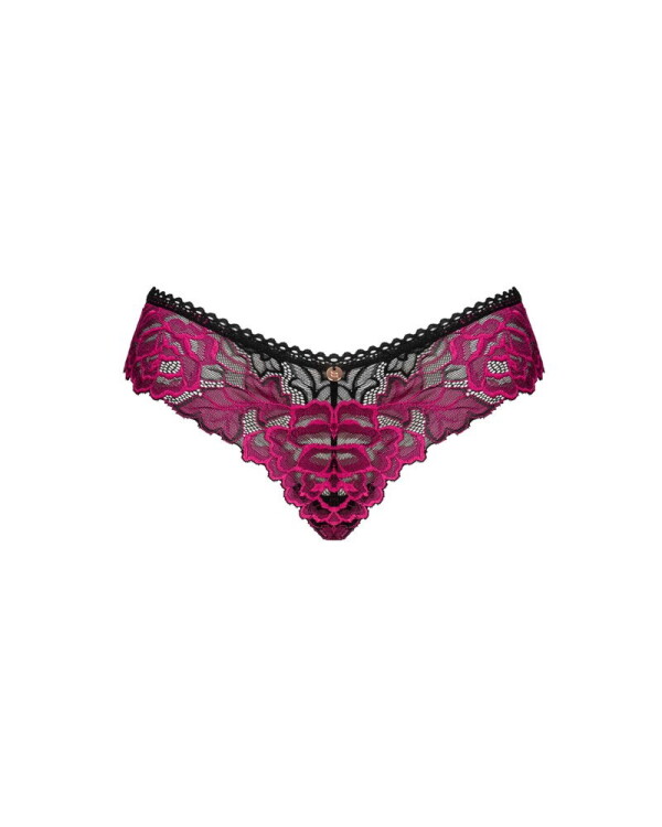 Zwart kanten slipje Rosenty van Obsessive afgezet met fijn roze rozenkant. Zacht en elastisch rondom voor volledig draagcomfort. Met een klein roségoudkleurig sierelement aan de voorkant van de tailleband.