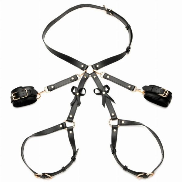 Dit mooie harnas is ontworpen om je taille, dijen en polsen vast te houden met riemen en boeien, en heeft strikken die de achterkant van je billen accentueren en je rondingen benadrukken.