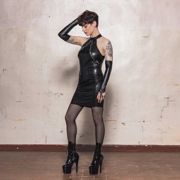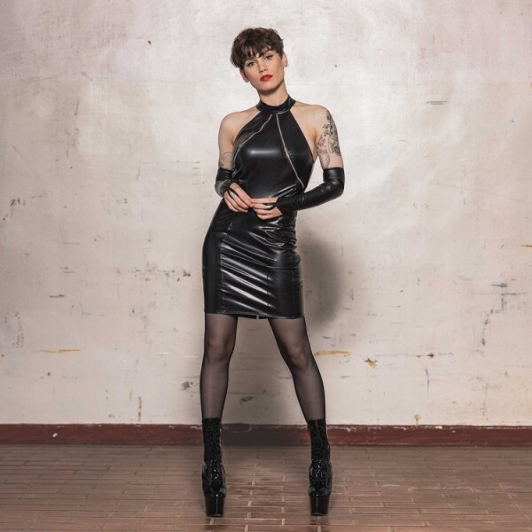 Sexy halterjurk met spannende ritsen over de borsten en een lange metalen rits aan de achterkant.