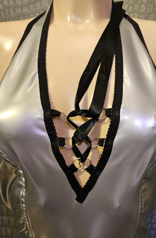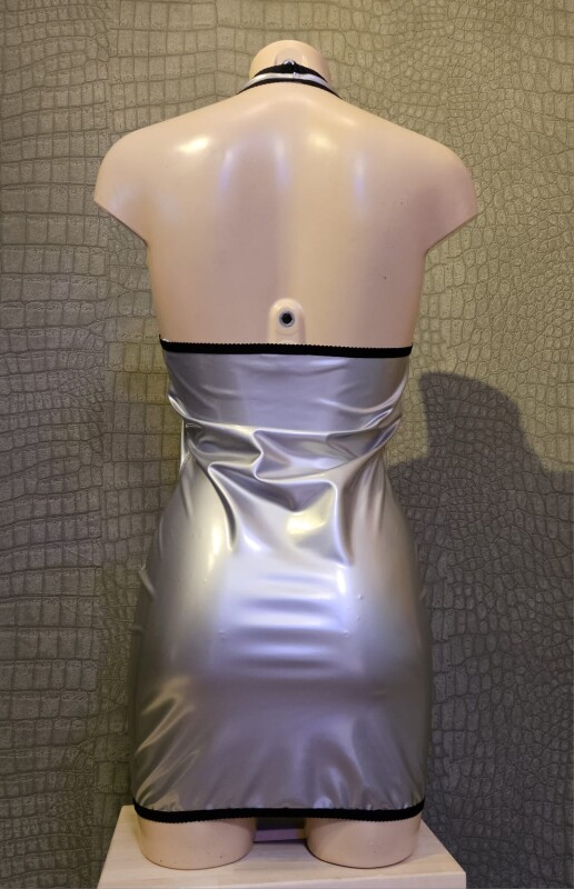 Kort halterjurkje van zilverkleurige elastische lak met sexy veter detail voorop.