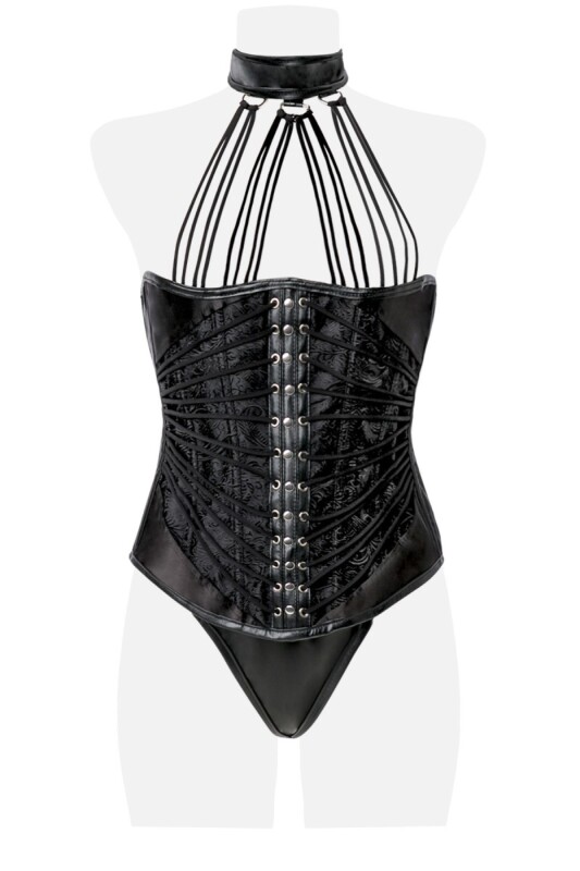 Onderborstkorset gemaakt van gevoerd kant en kunstleer, met mooie decoratieve veters over de borsten. Kraag met klittenbandsluiting. Vetersluiting aan de achterkant, rits aan de zijkant. Inclusief bijpassende string. Niet dresscode proof voor de kinky feesten.