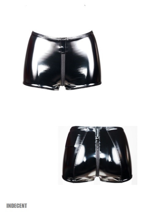 Prachtige hoge taille short van Benno von Stein,van glanzende lakstof. Met doorlopende rits van voor tot achter en handig klein zakje aan de binnenkant.