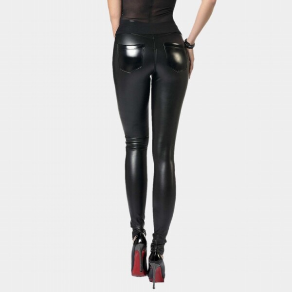 Kunstleren tregging met lange, naar achteren toelopende rits. Om de taille en op de achterzakken hoogglanzde zwarte lak.