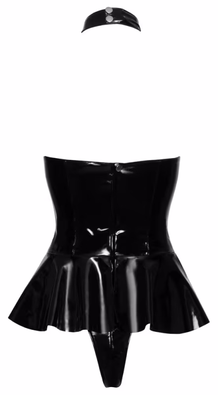 Geraffineerde bodysuit van Black Level met aangezette uitlopende rok volledig in zwarte lakglans. Nauw aansluitend op het figuur met 3 verstelbare gespbandjes aan het decolleté die leiden naar de halternek met dubbele verstelbare drukknoopsluiting. Voorkant met 4 gespriemen om de taille te accentueren. Opvallend rugloos - de ingewerkte ritssluiting op de rug wordt vastgezet met een drukknoop.