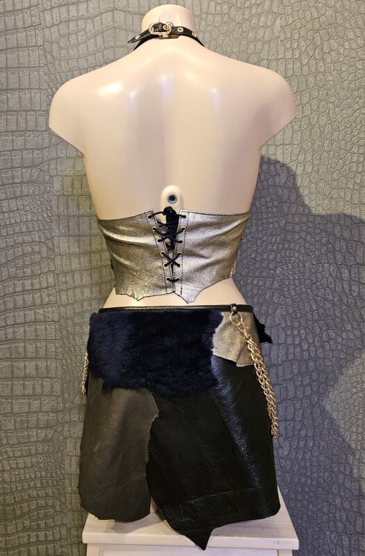 Set Odilia. Prachtige leren set afgewerkt met bont en metalen kettingen. Gemaakt van groen, bruin en goudkleurig leer, het kunstbont is donkerblauw, de kettingen zijn goudkleurig aluminium.