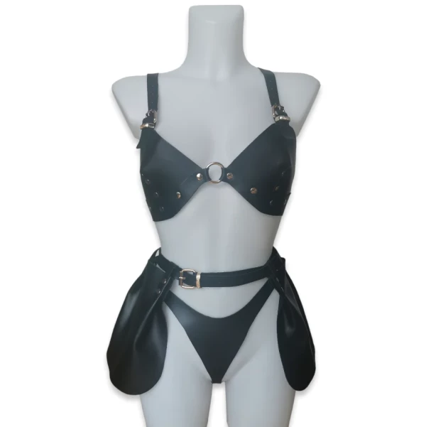 Plooirokje gemaakt van stevig zwart leer, met een open voorkant. Het rokje is aanpasbaar middels de riem met goudkleurige gesp.