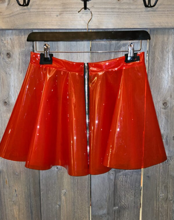 Prachtige cirkelrok gemaakt van transparant gekleurd PVC, met een lange regenboogkleurige metalen rits aan de voorkant. Superleuk in combinatie met de bijpassende top!.