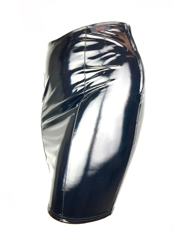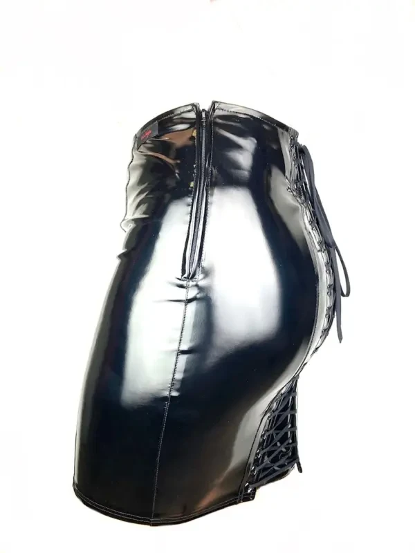 Kokerrok gemaakt van hoogglanzende zwarte lak met een sexy vetersluiting op de billen. Aan de zijkant een fraai weggewerkte korte rits om hret aantrekken te vergemakkelijken en zodat de rok mooi aanluit in de taille.
