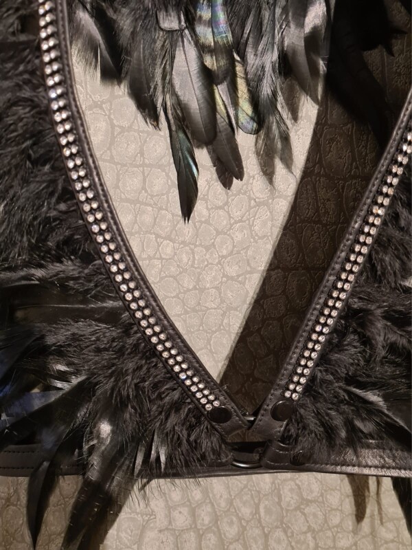 Prachtige veren boa gemaakt van leer met veren een een schtterende rij strass. Je maakt deze boa vast met 2 riempjes rond de taille, zodat het altijd mooi blijft zitten.
