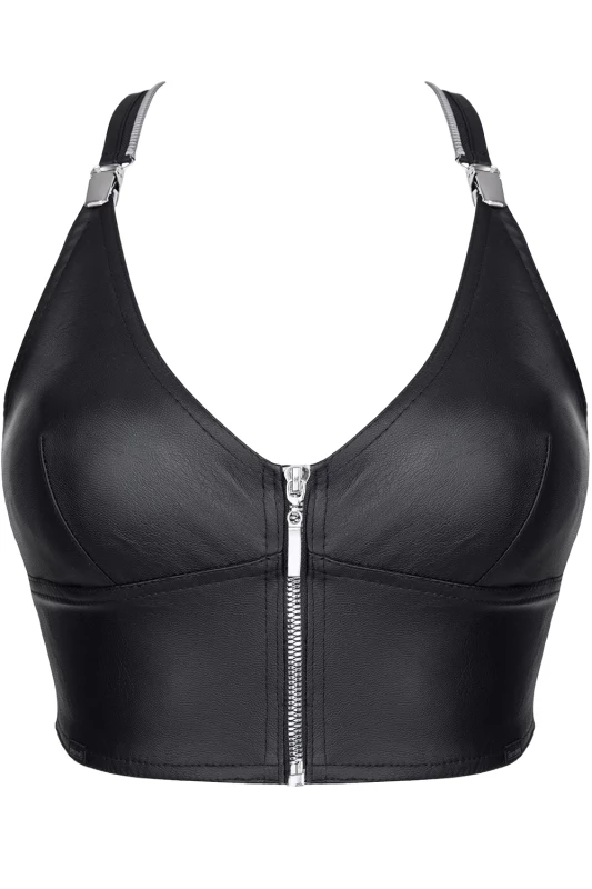 Kunstleren top met zilverkleurige metalen rits en verstelbare bandjes op de rug.