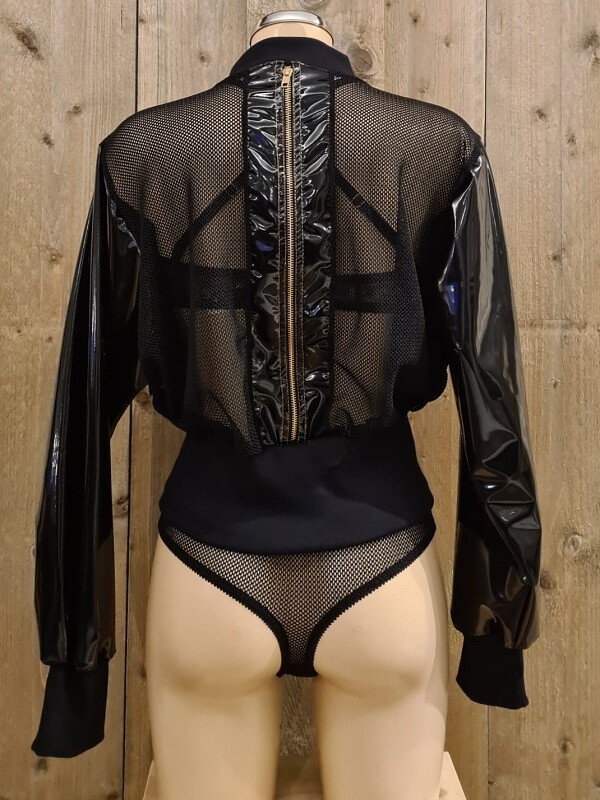 Supercool jasje, bomber model, in hoogglanzende zwarte lak met gazen rug en mooie goudkleurige metalen ritsen.