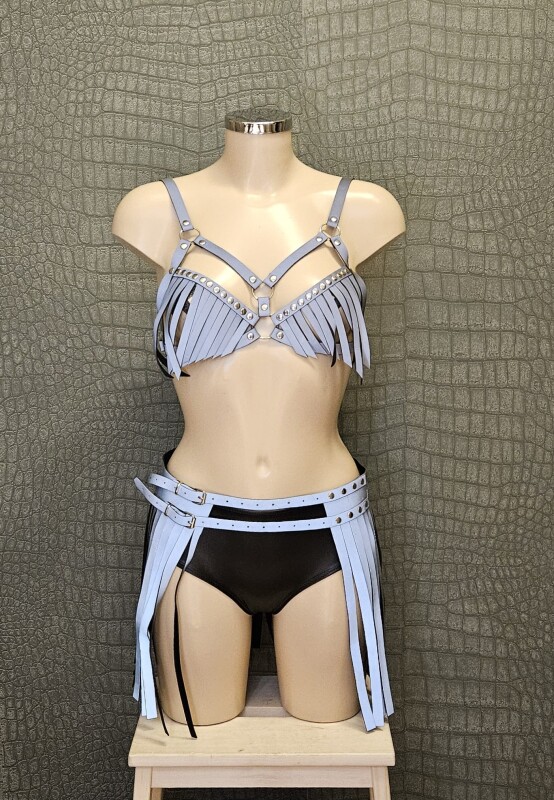 Kunstleren Bh-top met franjes. Deze top sluit in de nek en op de rug met verstelbare gespen.