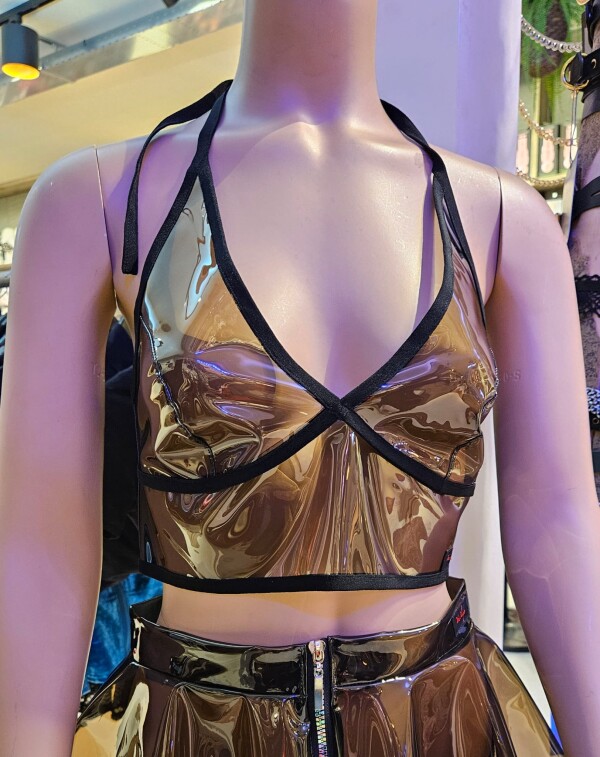 Sexy haltertop gemaakt van transparant vinyl, met zwarte belijning en een zwarte vetersluiting op de rug. door de vetersluitingen (hals en rug) sluit de top altijd mooi aan.