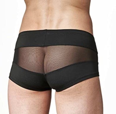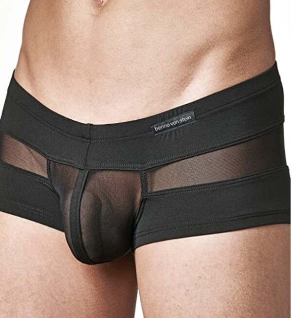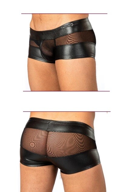 Heupboxer van kunstleer met doorzichtige tule pouch en tussenstukken. Laag model.