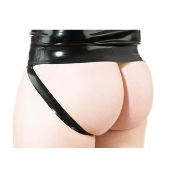 Latex jockstrap. Herenslip met bandjes onder de billen en een mooie licht voorgevormde pouch met een dubbele witte streep aan de voorkant. De brede band rond de heupen zorgt voor veel draagcomfort.