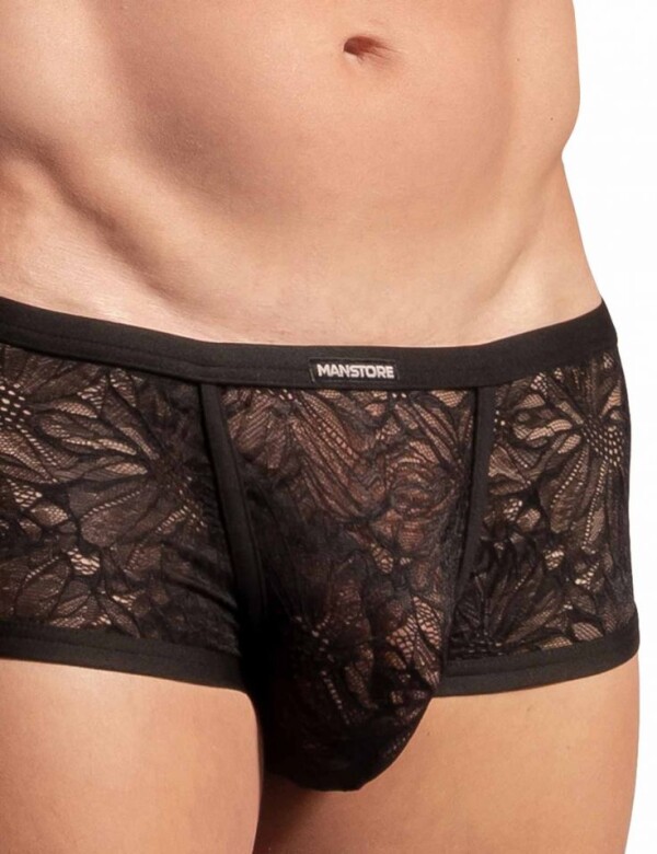 Sexy hotpants gemaakt van transparant kant met zwarte belijning.