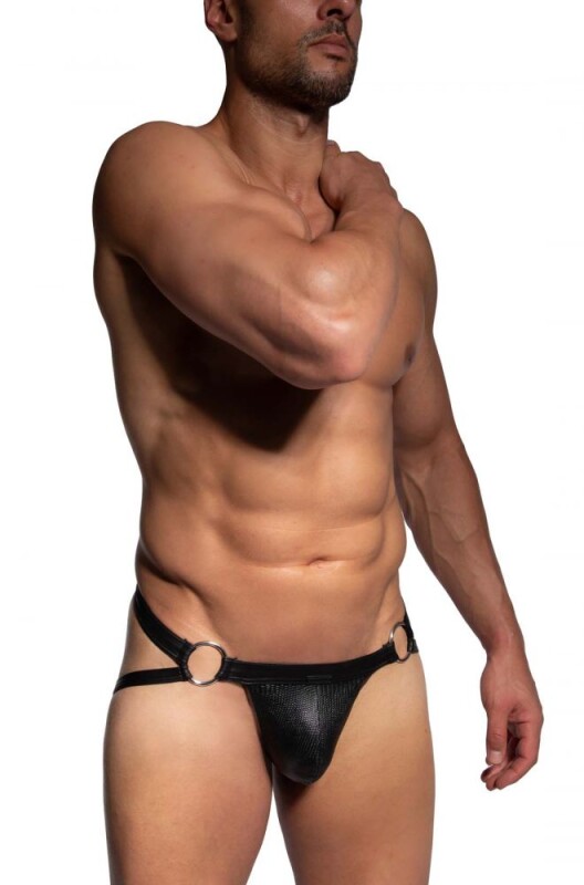Jockstrap gemaakt van een mix aan materialen. De heupband is gemaakt van stretchy wetlook, de pouch gemaakt van kunstleer met een 3-D slangenprint.