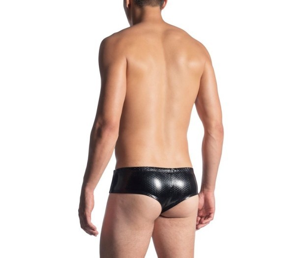 Heupslip van zwarte lakstof met reliëf.