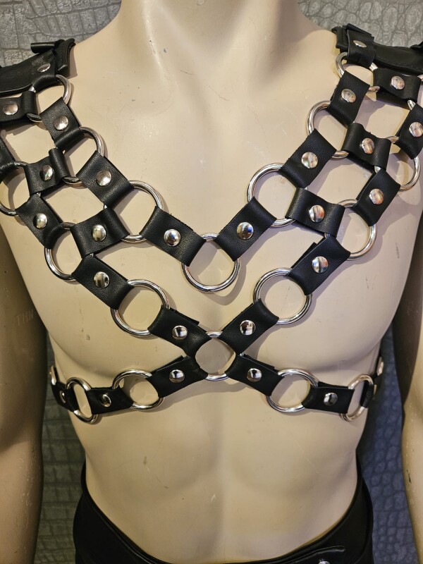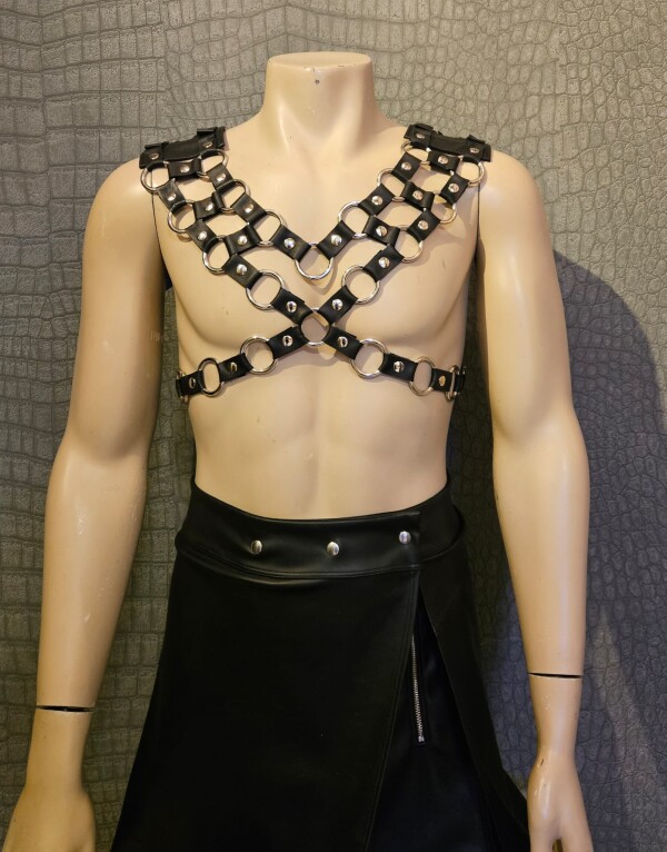 Prachtig schouderstuk gemaakt van zwart leer verbonden met zilverkleurige stalen ringen.