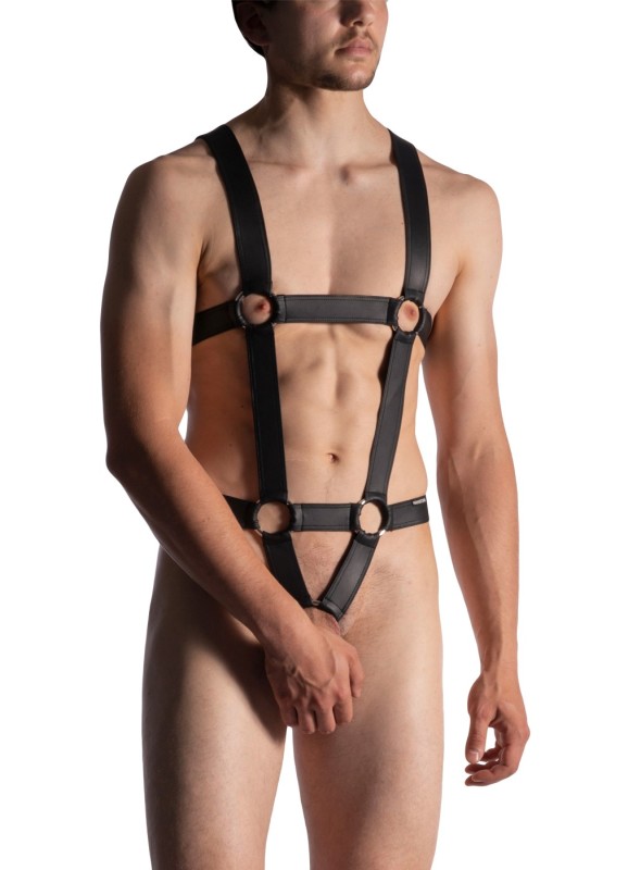Harnas in string model van stevige matte wetlookstof met grote RVS ringen. De onderste ring is bedoelt om te dragen als cockring en heeft een diameter van 55 mm.