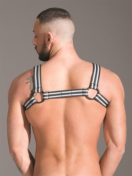 Neopreen borst harnas in zwart met grijs. Verstelbaar middels drukknopen. Neopreen is erg sterk en voelt zacht en comfortabel aan.
