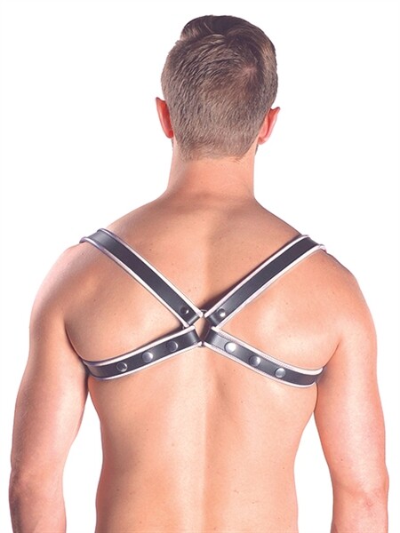 Stoer harnas van stevig zwart leer, goed afgewerkt met een witte leren bies zonder scherpe randen. Gevormd als een liggende 8, met een ring op de rug waaraan de 3 cm brede leren banden bevestigd zijn. Iedere band is voorzien van 3 drukknopen, waardoor ze in lengte aanpasbaar zijn, voor een optimale pasvorm.