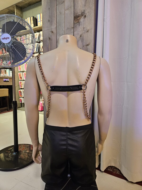 Basic harnas gemaakt van neopreen banden met daaraan bevestigd bronskleurige aluminium kettingen.