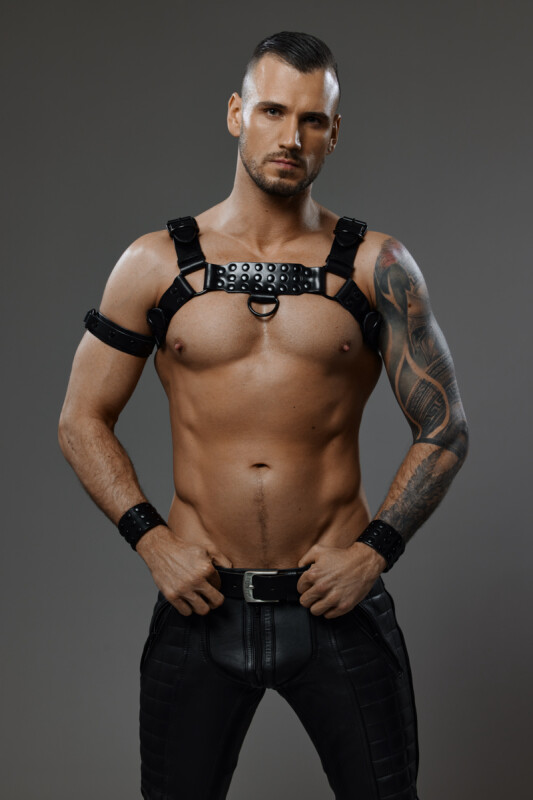 Stoer leren borstharnas met zwarte studs en gespen. Dit prachtige harnas is gemaakt van stevig, dik leer en voorzien van metalen gespen en ringen. De bicepsband op de foto is apart bij te bestellen.
