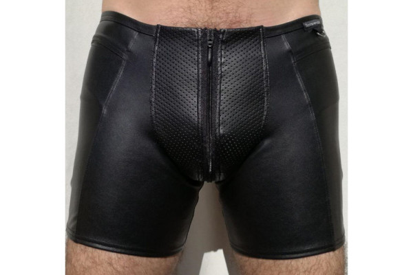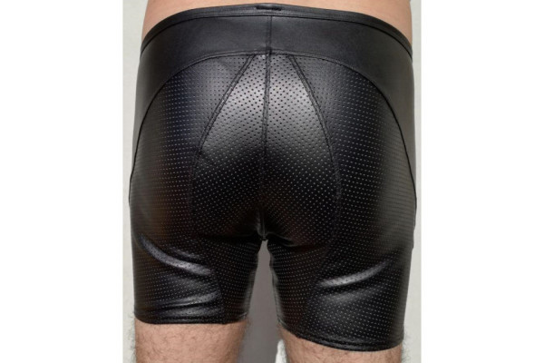 Bermuda van gaatjes- en uni-kunstleer,met rits van voor tot achter