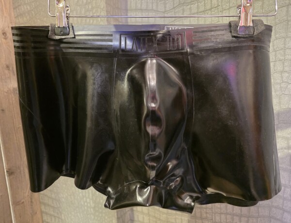 Latex shorts met fraai logo op de tailleband.