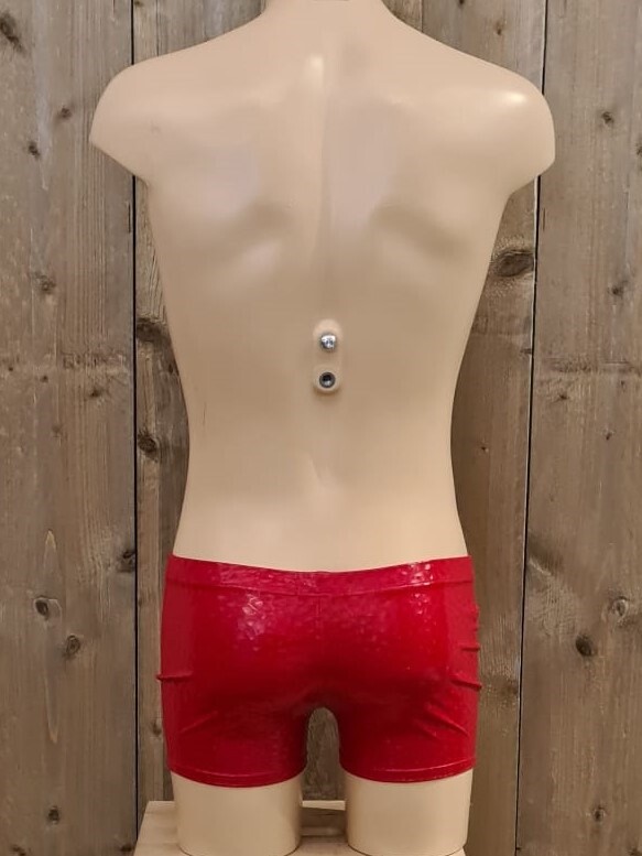 Nauw aansluitende boxer gemaakt van rode lak met een hologram print. Zonder rits.