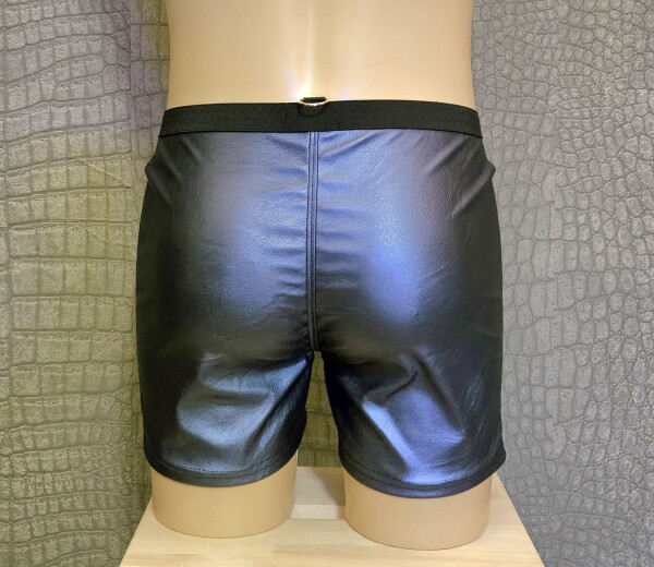 Stoere kunstleren korte broek met een iets langer pijpje dan gebruikelijk, gemaakt van metallic blauw kunstleer. De broek heeft een zilverkleurige metalen rits aan de voorkant.
